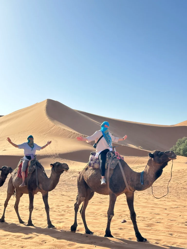 The adventure continues across the Middle Atlas Mountains to the Sahara Desert, where you will ride camels across the golden dunes of Erg Chebbi and spend an unforgettable night in a desert camp. Journey through the spectacular Dades Valley, visit the dramatic Todra Gorge, and explore the legendary kasbah of Ait Ben Haddou before crossing the High Atlas Mountains to reach the vibrant city of Marrakech.