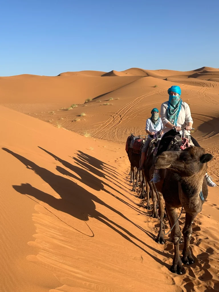 The adventure continues across the Middle Atlas Mountains toward the Sahara Desert, where you will ride camels across the golden dunes of Erg Chebbi and spend a magical night in a desert camp. Travel through the dramatic landscapes of Todra Gorge and the scenic Dades Valley before visiting the legendary kasbah of Ait Ben Haddou and finishing your journey in vibrant Marrakech.